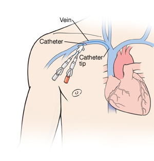The central line will be placed into 1 of the veins as described below. Which vein is used depends on your needs and overall health. The catheter is threaded through the vein. It is passed along until the tip sits in the large vein near the heart (vena cava). Types of central lines include: